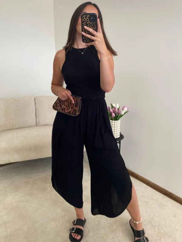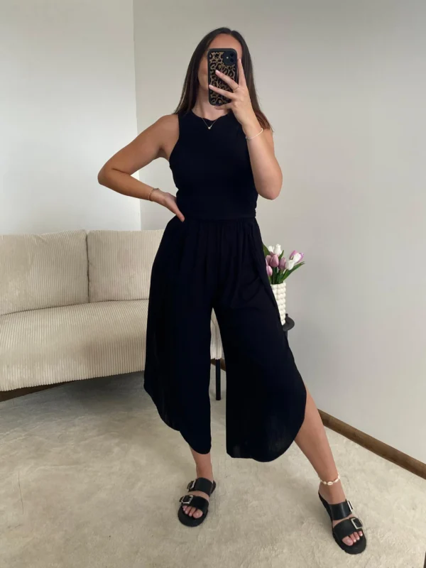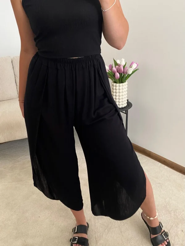 Tieto nohavice sú dokonalým spojením pohodlia a štýlu. Voľný strih zabezpečuje maximálne pohodlie, zatiaľ čo elastický pás sa prispôsobí postave a vytvára uvoľnený, no upravený vzhľad. Bočné rozparky dodávajú nohaviciam jemne odhalený detail a vzdušnosť, vďaka čomu sú ideálne na letné dni. Čierna farba umožňuje ľahké kombinovanie – či už s jednoduchým tielkom, košeľou alebo crop topom.