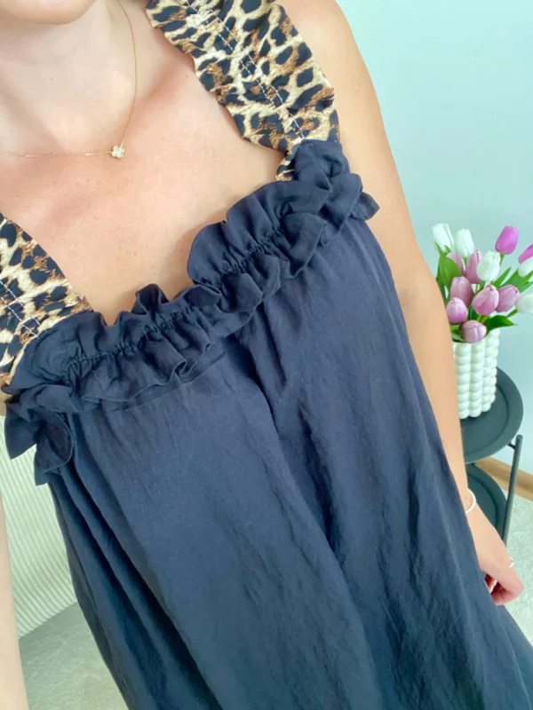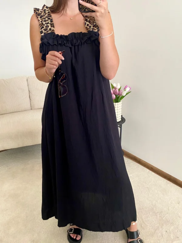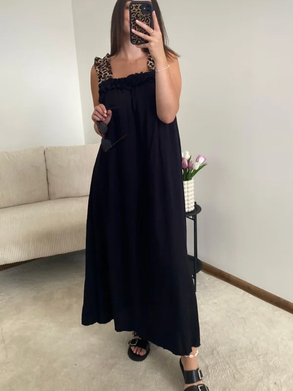 Tieto čierne šaty z mäkkej, vzdušnej viskózy zaujmú nielen pohodlným strihom, ale aj výrazným leopardím vzorom, ktorý dodáva sebavedomý a moderný vzhľad. Hrubé ramienka poskytujú oporu a zvýrazňujú ramená, zatiaľ čo voľne padajúci materiál lichotí každej postave.