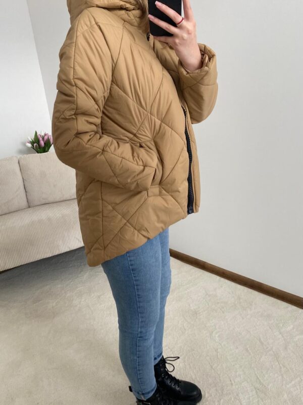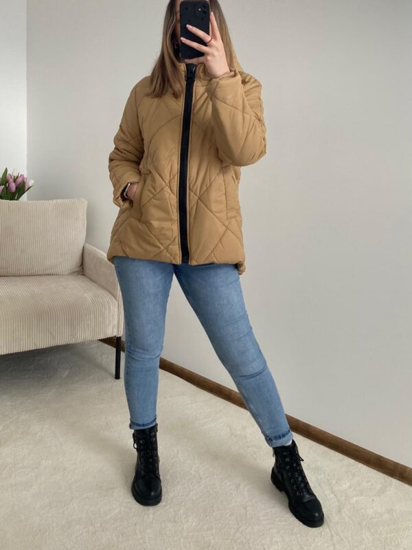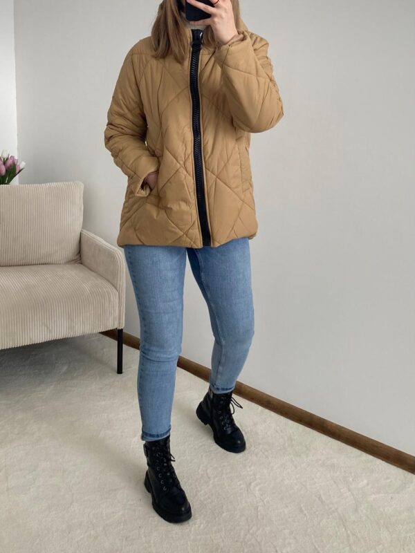 Tenšia bunda z nylónovej prešívanej látky s hrubým, výrazným zipsom. Bunda je vzadu predĺžená. Vhodná na prechodné obdobie.