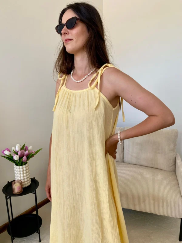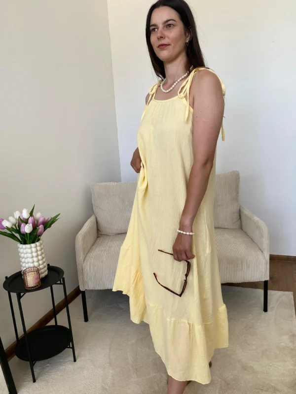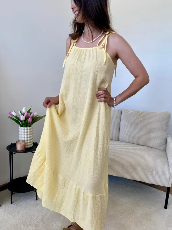 Ľahké mušelinové maxi šaty s tenkými ramienkami a voľným strihom, ktoré pôsobia elegantne a vzdušne. Príjemný materiál zaistí komfort počas letných dní. Veľkosť je univerzálna, šaty sedia od XS-L. Ramienka nie sú nastaviteľné.